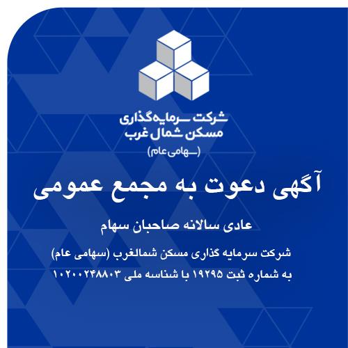 بدینوسیله به اطلاع سهامداران محترم شرکت سرمایه¬گذاری مسکن شمالغرب (سهامی عام) به شماره ثبت 19295 با شناسه ملی 10200248803 میرساند، مجمع عمومی عادی سالانه سال مالی منتهی به 1404/06/31 شرکت، ساعت 10:00 صبح روز چهار¬شنبه مورخ 1404/09/05 در محل سالن اجتماعات هتل پتروشیمی به نشانی: تبریز- گلکار- مجتمع پتروشیمی برگزار میشود.